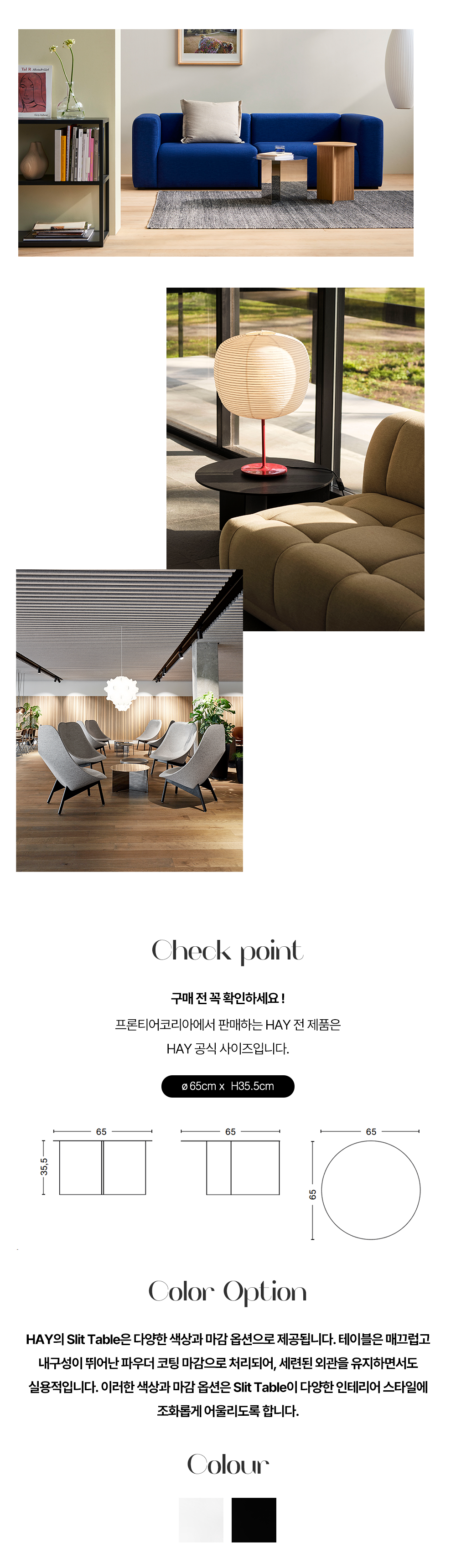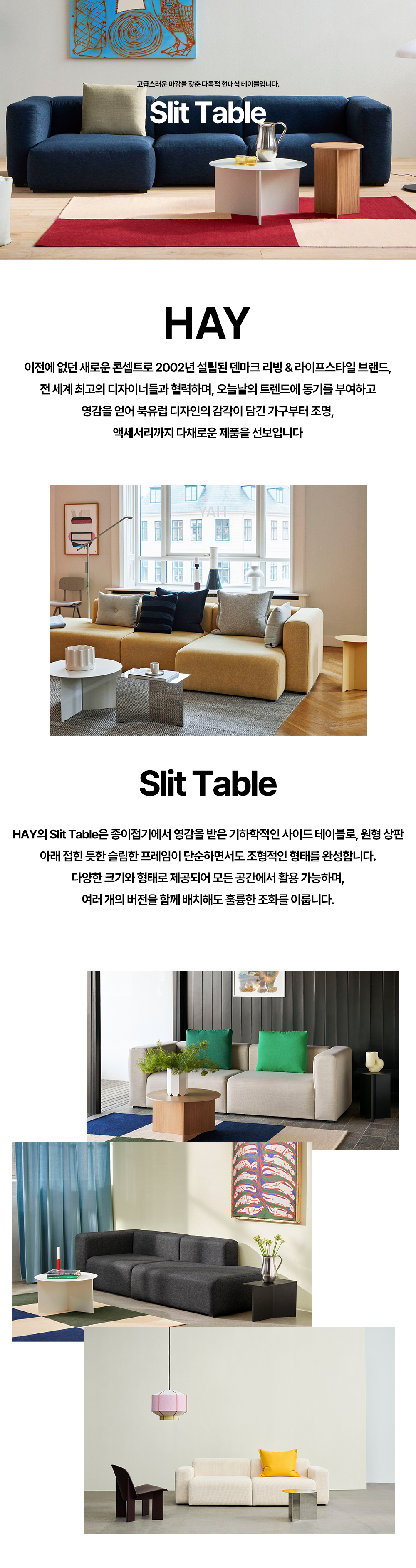 HAY의 Slit Table은 종이접기에서 영감을 받은 기하학적인 사이드 테이블로, 원형 상판 아래 접힌 듯한 슬림한 프레임이 단순하면서도 조형적인 형태를 완성합니다.