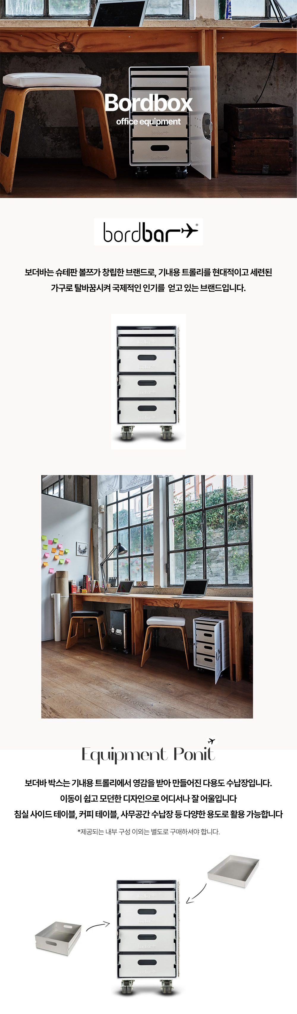 보더바 박스는 기내용 트롤리에서 영감을 받아 만들어진 다용도 수납장입니다. 이동이 쉽고 모던한 디자인으로 어디서나 잘 어울입니다 침실 사이드 테이블, 커피 테이블, 사무공간 수납장 등 다양한 용도로 활용 가능합니다